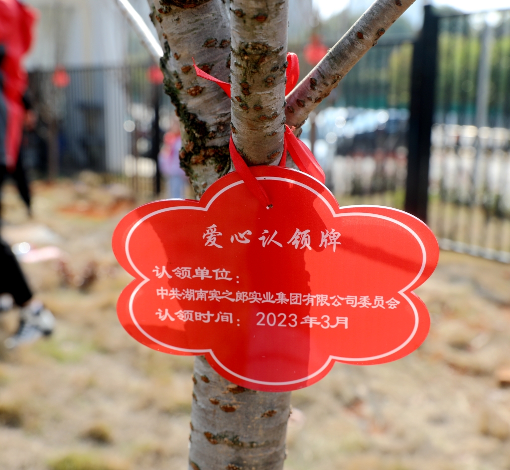 完成種植后,大家為樹苗系上獨(dú)屬賓之郎黨委的愛心認(rèn)領(lǐng)牌,并與小樹合影留念。